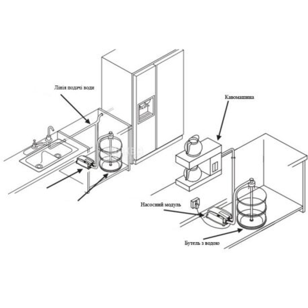 З дистанційною помпою для води Ви зможете розмістити бутель під мийкою, таким чином економлячи простір на кухні.