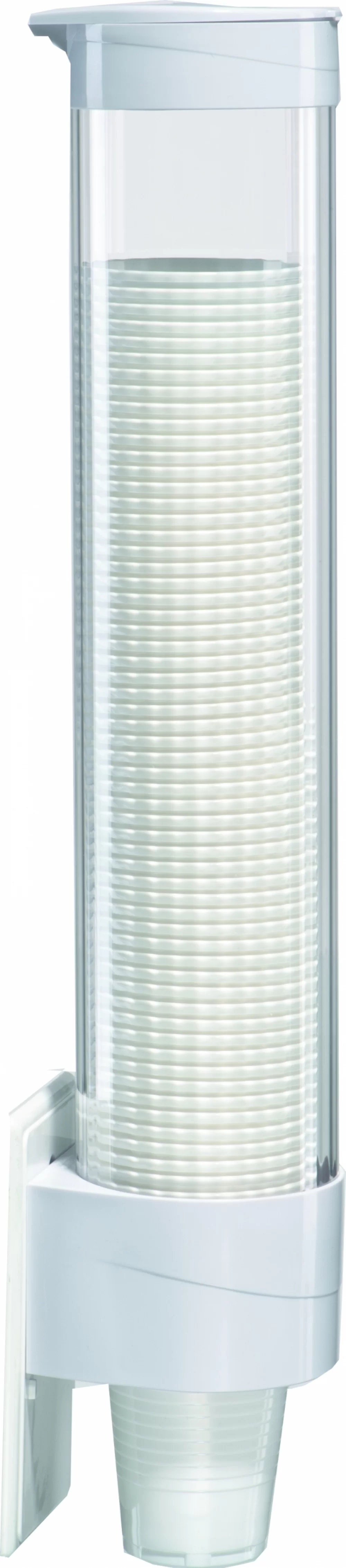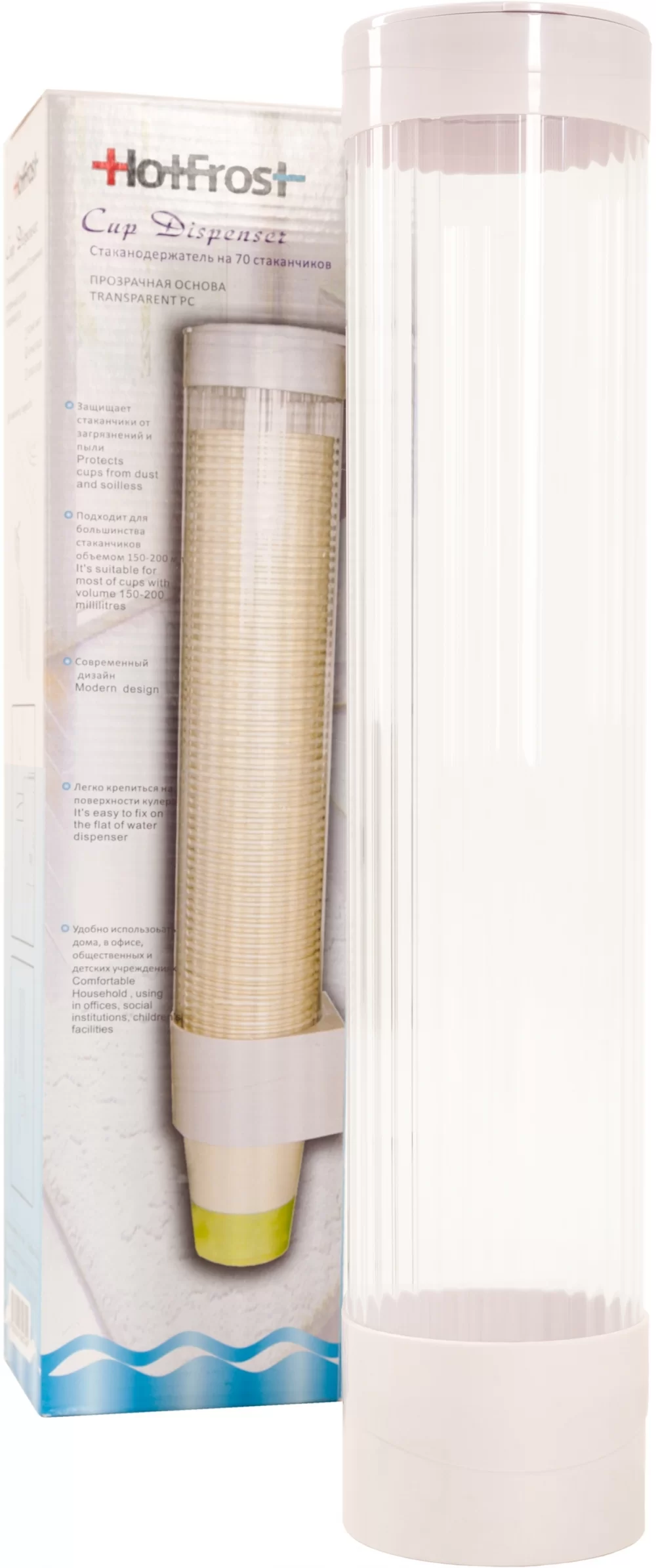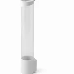 Ёмкость для стаканчиков изготовлена из прозрачного пластика, а крышка и крепёжная часть из пластика белого цвета.